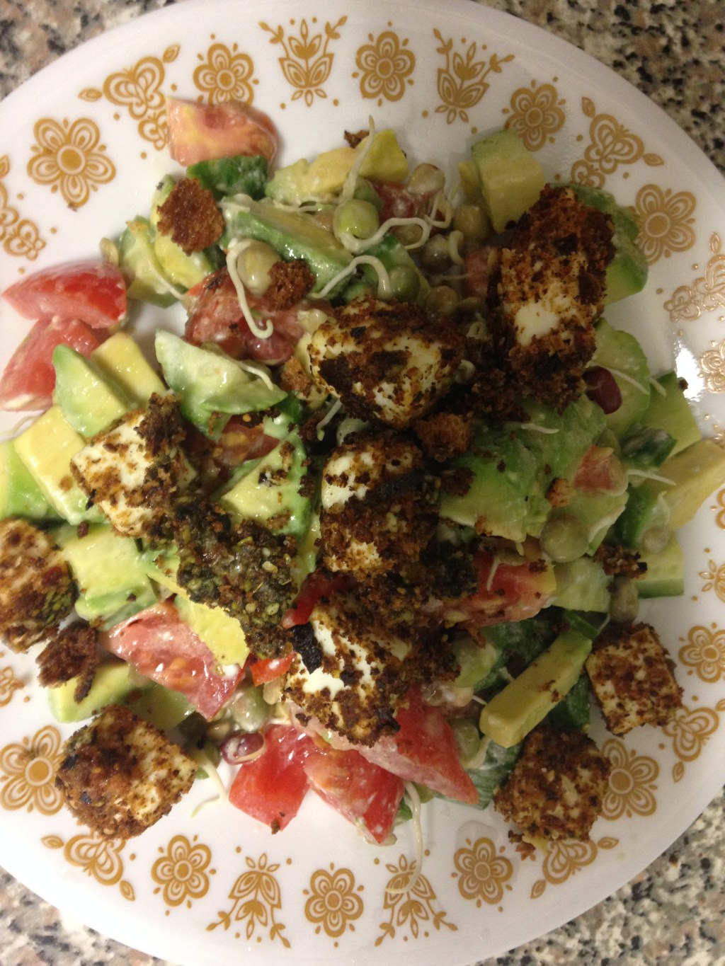 While my cheese pieces were frying, I diced the tomato, cucumber, avocado and added to the bowl with sprouts.