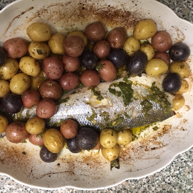 Since my daughter was coming, I wanted to make something a bit special for her. She does not like salmon, so I got a whole branzini and some cute multicolored tiny potatoes. You can, of course, use any whole fish with this recipe, and just regular potatoes that you will need to cut in small pieces.