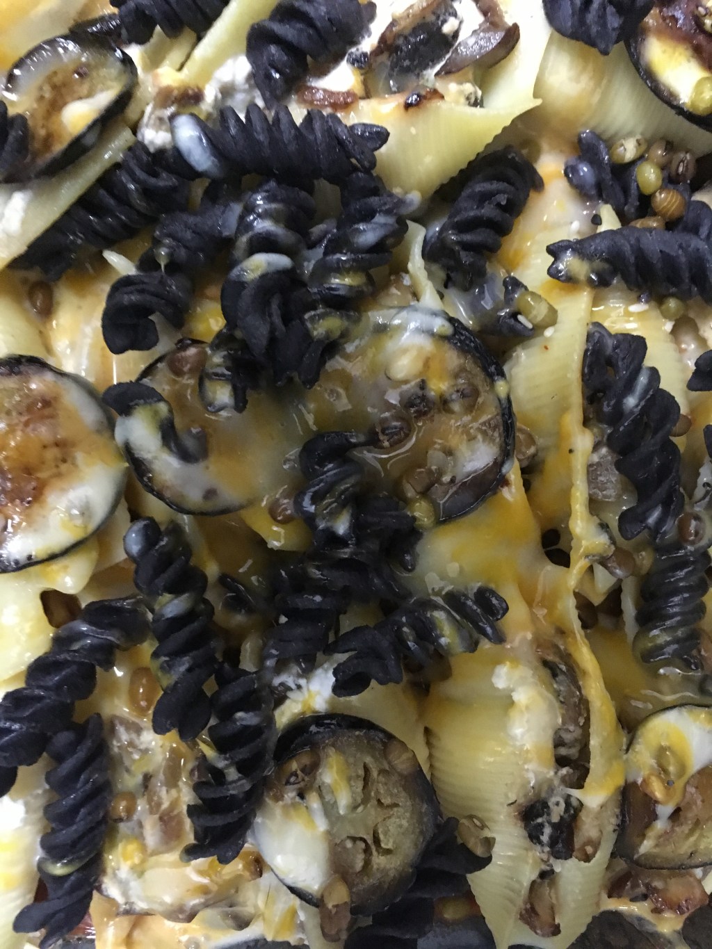 Then I stuffed my pasta with the ricotta and mushroom mix, and layered the shells on top of the eggplant.