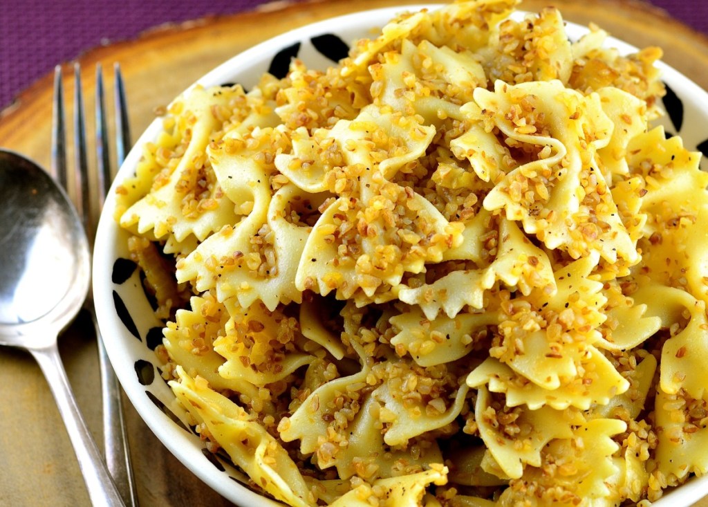 I also don’t use any egg or mini-kasha that she mentions in the video. I am not too sold on crunchy kasha. I love mine to blend easily with the noodles. I also cook everything separate first, and them put it together. I also do quite a bit more kasha than noodles, but this may be because I am all into healthy now, and where does one find healthy bowtie pasta? I do use olive or sunflower oil since we do not eat meat, but, indeed, my grandmother would use schmaltz.